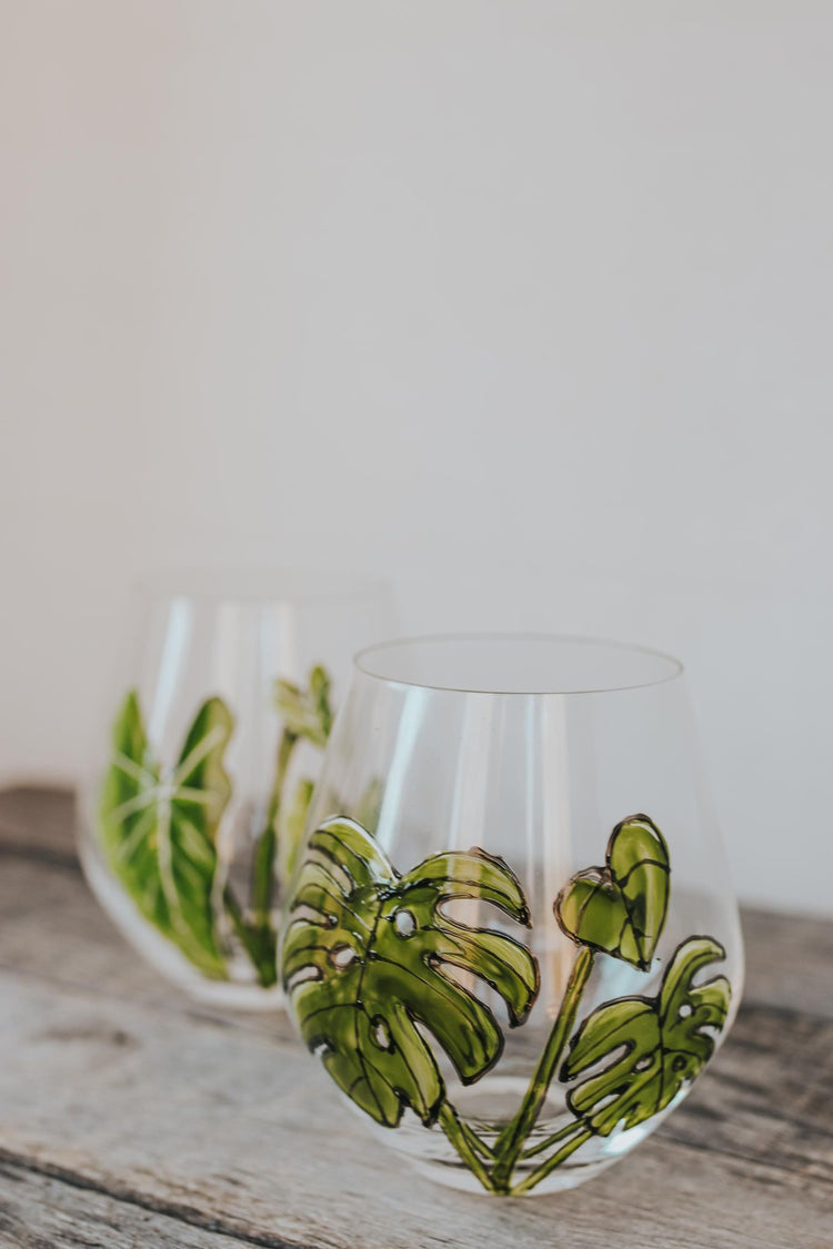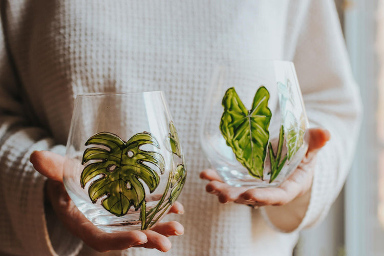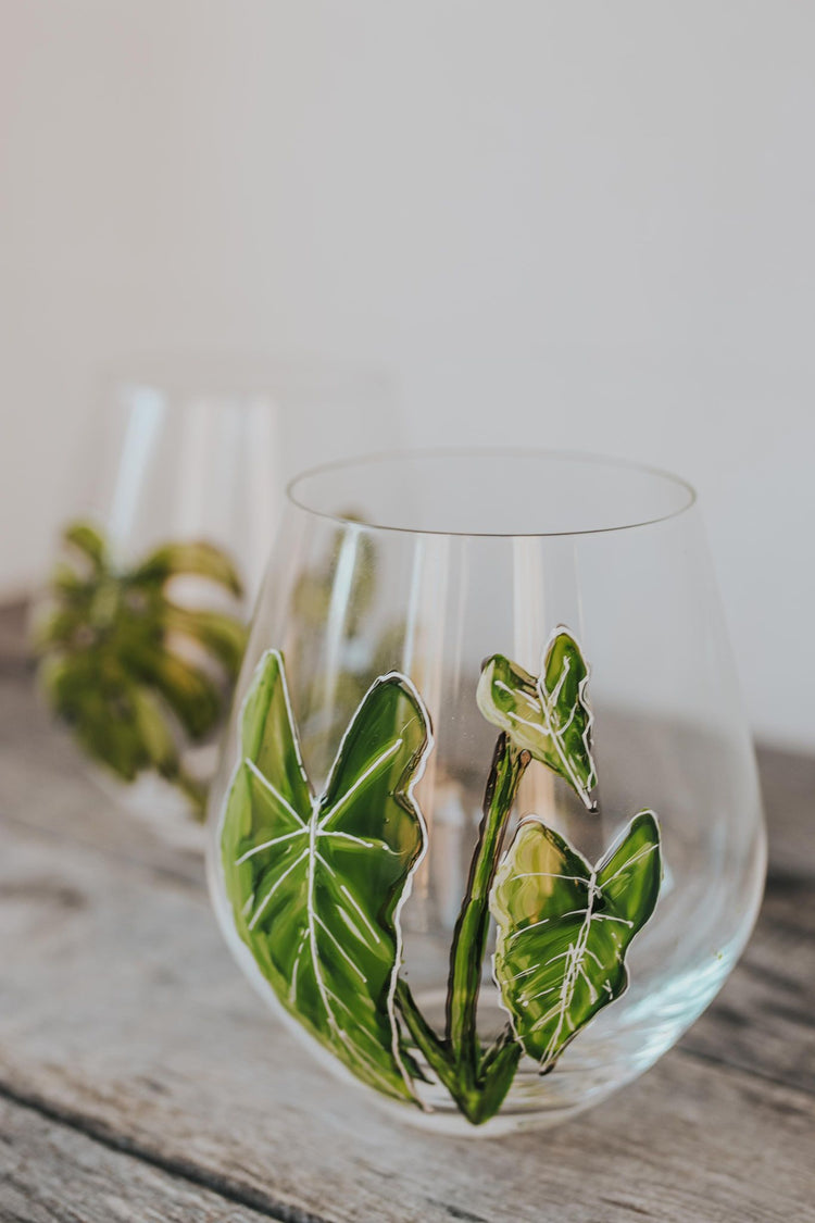 Passionné des plantes offrez-vous ce duo de verre unique et coloré, design de plante Monstera et Alocasia peintes à la main par Pero.